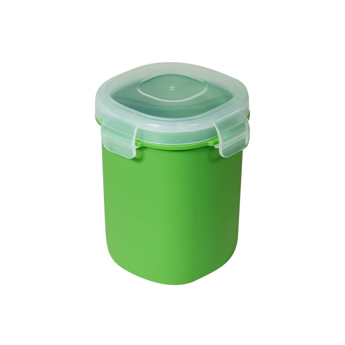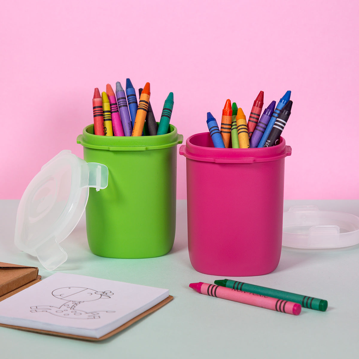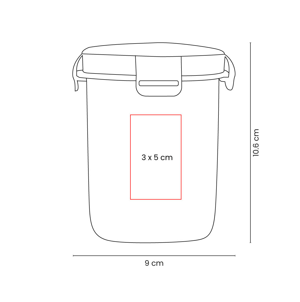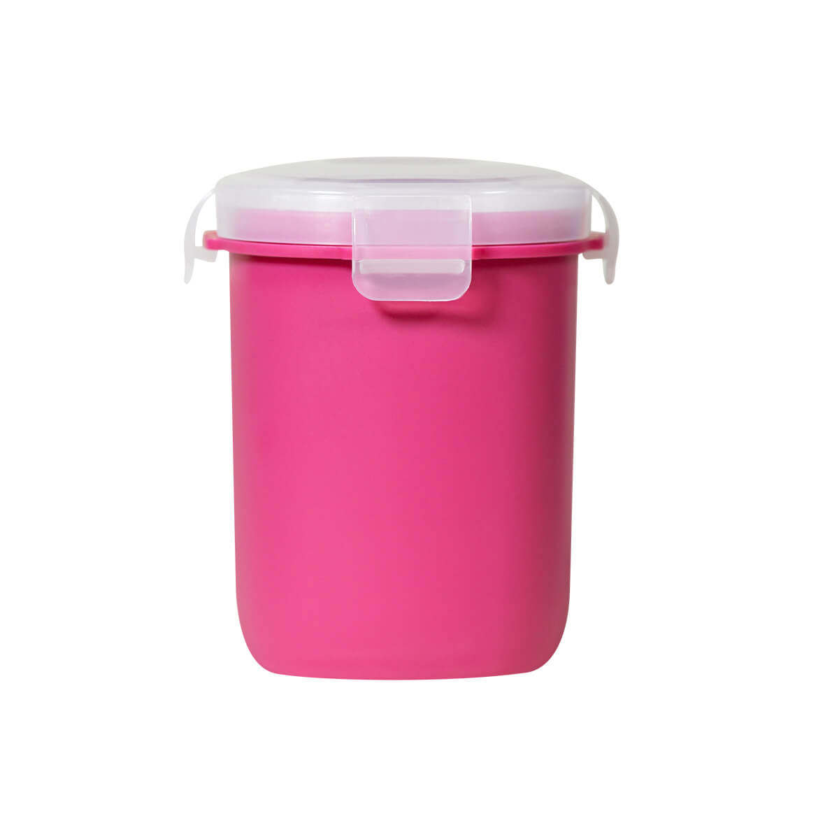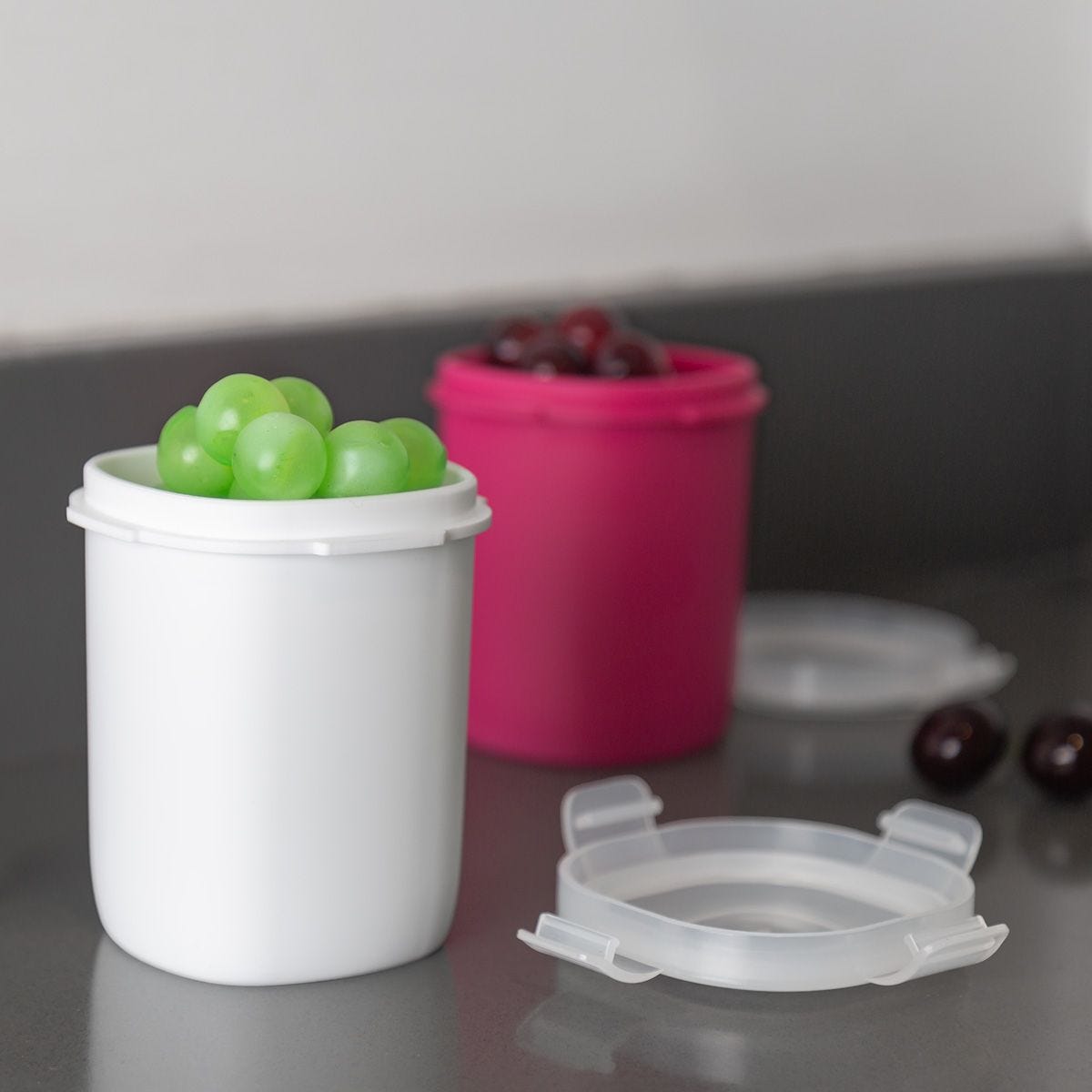 Vasito contenedor de plastico con tapa con cuatro pestanas y sello hermetico para evitar derrames. Compacto y versatil, es perfecto para llevar tus snacks sin preocupaciones.