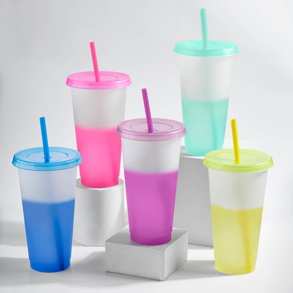 Vaso de plastico de una pared. Anade fantasia y diversion, con este vaso que cambia de color al verter bebidas frias. Su tapa y popote, coinciden con el tono que el vaso revelara al enfriarse, dando como resultado, un conjunto armonioso y divertido. Perfecto para quienes buscan una experiencia refrescante y visualmente atractiva en cada bebida. Capacidad 27 Oz. Base de 6.4 cm.