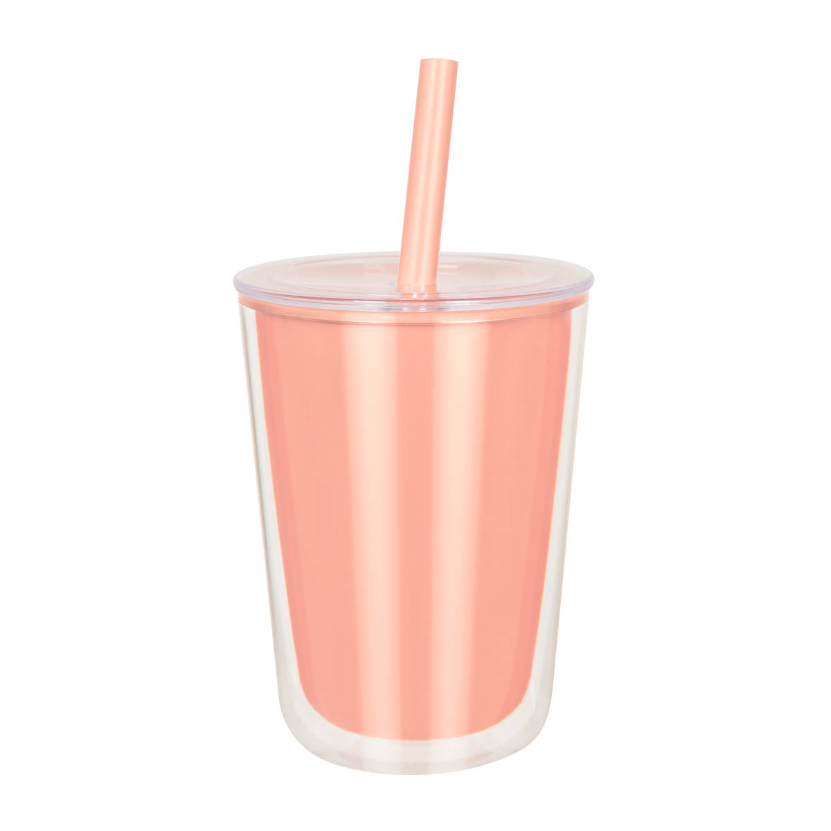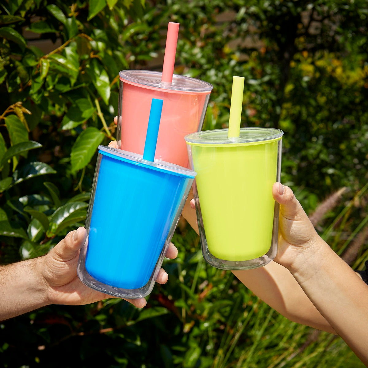 Vaso de plastico doble pared. Su peculiar diseno, cuenta con una pared interna de color y una pared externa transparente, que le da un aspecto moderno y vibrante. La tapa con cierre push y el popote a juego, anaden originalidad a este vaso. Ideal para llevar tus bebidas favoritas a donde vayas. Capacidad de 23 Oz. Base de 9 cm de diametro. Incluye caja individual.