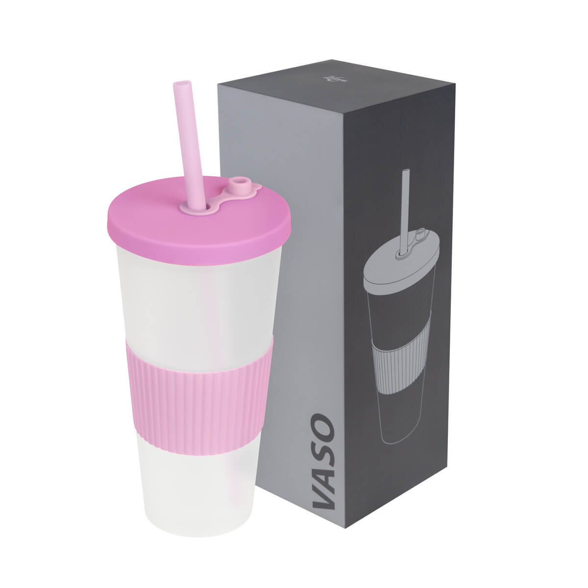 Vaso doble pared. Pared interna y externa de plástico. Tapa de plástico con sistema de rosca. Incluye popote. Cuerpo frosty con terminado suave. Su diseño con manga de silicón antideslizante garantiza un agarre cómodo y seguro. Capacidad 22 Oz. Base de 6.4 cm de diámetro. Caja individual incluida.